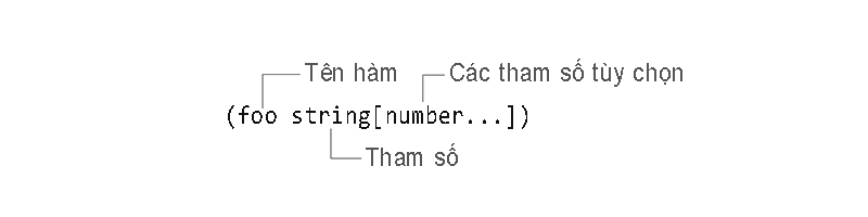 Trong ví dụ này, hàm foo có một đối số được yêu cầu, string, và một đối số tùy ý, number. Các đối số number bổ sung có thể được cung cấp. Thông thường, tên của đối số được chỉ định loại dữ liệu được mong đợi. Các ví dụ trong bảng sau đây trình bày các lệnh gọi hợp lệ và không hợp lệ đến hàm foo.